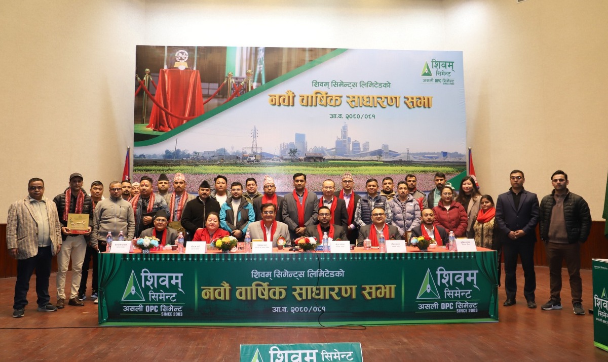शिवम् सिमेन्ट्सका संचालक अध्यक्ष गौरव गोयलको अध्यक्षतामा राष्ट्रिय सभा गृह, प्रर्दशनीमार्ग, काठमाडौंमा आयोजना गरेको सभाले कम्पनी संचालक समितिको निर्णयले वार्षिक साधारण सभा समक्ष पारित गर्न प्रस्तावित वार्षिक प्रगति प्रतिवेदन, लेखापरीक्षकको प्रतिवेदन सहितका विवरणहरु पारित गर्ने, आगामी आव २०८१/०८२ का लागि लेखापरीक्षक नियुक्त गर्ने समेतका सामान्य प्रस्तावहरु र वोनस शेयर वितरण गरे पश्चात कम्पनीको चुक्ता र जारी पूंजी समेत बृद्धि भई कम्पनीको जारी तथा चुक्ता पूंजी ५ अर्व ४५ करोड ६८ लाख ८ हजार ५ सय रुपैयाँ कायम गर्ने समेतका सबै सामान्य र विशेष प्रस्तावहरु पारीत गरी वार्षिक साधारण सभा सम्पन्न गरेको छ ।