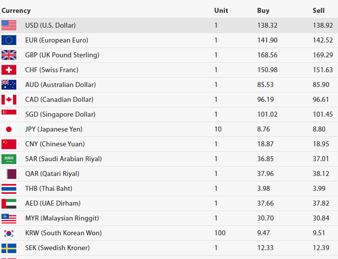 निर्धारित विनिमयदर अनुसार आज अमेरिकी डलर एकको खरिददर एक सय ३८ रुपैयाँ ३२ पैसा र बिक्रीदर एक सय ३८ रुपैयाँ ९२ पैसा कायम भएको छ । तोकिएको विनिमयदर अनुसार युरोपियन युरो एकको खरिददर एक सय ४१ रुपैयाँ ९० पैसा र बिक्रीदर एक सय ४२ रुपैयाँ ५२ पैसा, युके पाउन्ड स्ट्रलिङ एकको खरिददर एक सय ६८ रुपैयाँ ५६ पैसा र बिक्रीदर एक सय ६९ रुपैयाँ २९ पैसा, स्विस फ्र्याङ्क एकको खरिददर एक सय ५० रुपैयाँ ९८ पैसा र बिक्रीदर एक सय ५१ रुपैयाँ ६३ पैसा कायम गरिएको छ ।