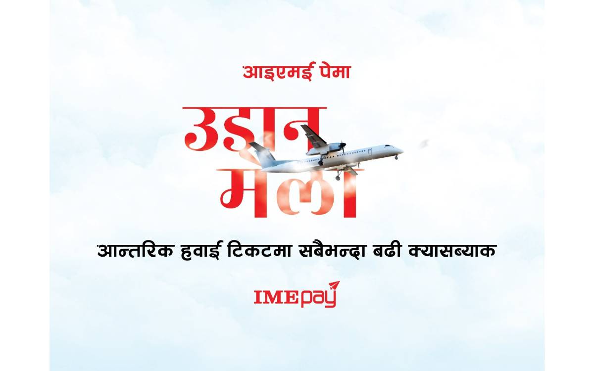 काठमाडौं । नेपालको पहिलो डिजिटल वालेट ‘आइएमई पे’ ले आन्तरिक हवाई टिकटमा सबैभन्दा बढी क्यासब्याक प्रदान गर्ने उदेश्यका साथ ‘उडान मेला’ नामक योजना सार्वजनिक गरेको छ ।