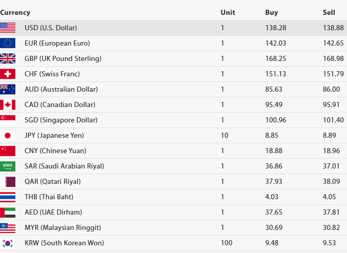 राष्ट्र बैंकले हङकङ डलर एकको खरिददर १७ रुपैयाँ ७६ पैसा र बिक्रीदर १७ रुपैयाँ ८४ पैसा, कुवेती दिनार एकको खरिददर चार सय ४७ रुपैयाँ ९७ पैसा र बिक्रीदर चार सय ४९ रुपैयाँ ९२ पैसा, बहराइन दिनार एकको खरिददर तीन सय ६६ रुपैयाँ ८४ पैसा र बिक्रीदर तीन सय ६८ रुपैयाँ ४४ पैसा, ओमनी रियाल एकको खरिददर तीन सय ५९ रुपैयाँ १९ पैसा र बिक्रीदर तीन सय ६० रुपैयाँ ७५ पैसा तोकिएको छ । यस्तै, भारतीय रुपैयाँ एक सयको खरिददर एक सय ६० रुपैयाँ र बिक्रीदर एक सय ६० रुपैयाँ १५ पैसा निर्धारण भएको छ ।