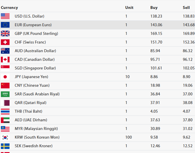 राष्ट्र बैंकका अनुसार आजका लागि अमेरिकी डलर एकको खरिददर एक सय ३८ रुपैयाँ २३ पैसा र बिक्रीदर एक सय ३८ रुपैयाँ ८३ पैसा कायम भएको छ । युरोपियन युरो एकको खरिददर एक सय ४३ रुपैयाँ ०६ पैसा र बिक्रीदर एक सय ४३ रुपैयाँ ६८ पैसा, युके पाउण्ड स्ट्रलिङ एकको खरिददर एक सय ६९ रुपैयाँ १५ पैसा र बिक्रीदर एक सय ६९ रुपैयाँ ८९ पैसा, स्वीस फ्र्याङ्क एकको खरिददर एक सय ५१ रुपैयाँ ७० पैसा र बिक्रीदर एक सय ५२ रुपैयाँ ३६ पैसा कायम गरिएको छ ।