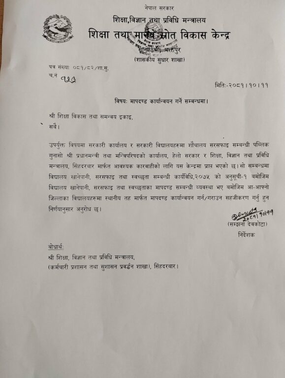 केन्द्रले सूचना जारी गर्दै भनेको छ, ‘सो सम्बन्धमा विद्यालय खानेपानी, सरसफाइ तथा स्वच्छता सम्बन्धी कार्यविधि, २०७५ को अनुसूची–१ बमोजिम विद्यालय खानेपानी, सरसफाइ तथा स्वच्छता मापदण्ड सम्बन्धी व्यवस्था भए बमोजिम आ–आफ्नो जिल्लाका विद्यालयहरुमा स्थानीय तहमार्फत कार्यान्वयन गर्न–गराउन सहजीकरण गर्नुहुन निर्णयानुसार अनुरोध छ ।’