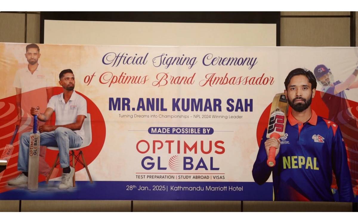 काठमाडौं । नेपाली राष्ट्रिय क्रिकेट टोलीका सदस्य अनिलकुमार साह अप्टिमस ग्लोबलको ब्राण्ड एम्बासडर नियुक्तमा भएका छन् । नक्सालमा मंगलबार पत्रकार सम्मेलनमार्फत अप्टिमस ग्लोबललाई नेपाली क्रिकेट टोलीका ब्याटर अनिललाई ब्राण्ड एम्बासडर घोषणा गरेको हो ।