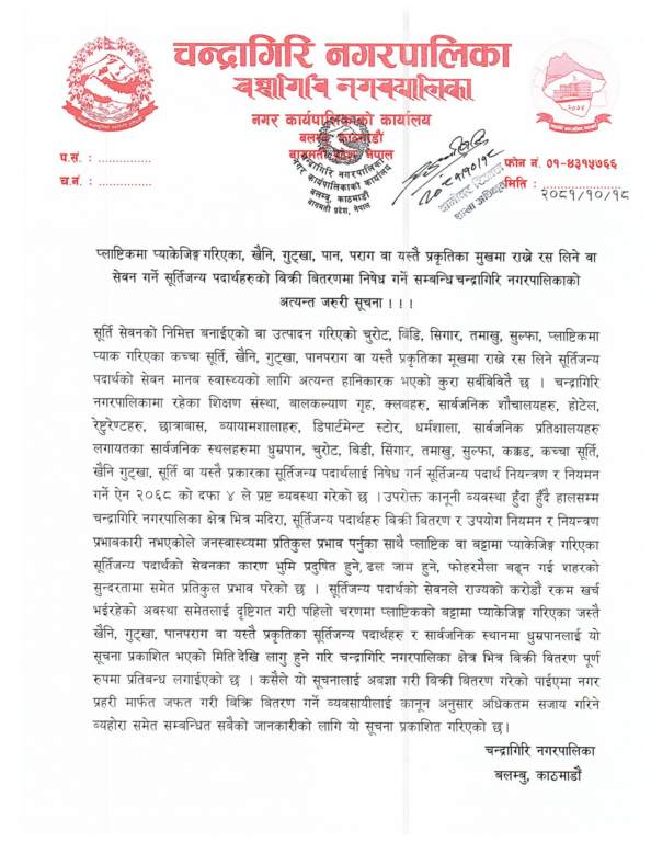 काठमाडौं । चन्द्रागिरि नगरपालिकाले सुर्तीजन्य वस्तु आयात, बिक्री तथा प्रयोगमा प्रतिबन्ध लगाउने निर्णय गरेको छ ।