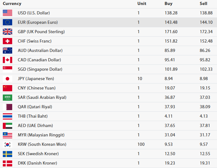 युरोपियन युरो एकको खरिददर १४३ रूपैयाँ ४८ पैसा र बिक्रीदर १४४ रूपैयाँ १० पैसा, युके पाउण्ड स्ट्रलिङ एकको खरिददर १७१ रूपैयाँ ६० पैसा र बिक्रीदर १७२ रूपैयाँ ३४ पैसा, स्वीस फ्र्याङ्क एकको खरिददर १५१ रूपैयाँ ८२ पैसा र बिक्रीदर १५२ रूपैयाँ ४८ पैसा कायम गरिएको छ ।