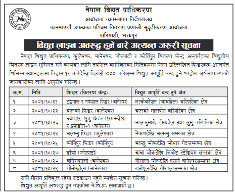 प्राधिकरणको कुलेश्वर वितरण केन्द्र, बानेश्वर वितरण केन्द्र, जोरपाटी वितरण केन्द्र र कीर्तिपुर वितरण केन्द्र अन्तरगतका विभिन्न स्थानहरुमा बिहान ११ बजेदेखि दिउँसो ४ बजेसम्म विद्युत् आपूर्ति बन्द गर्न लागेको हो ।