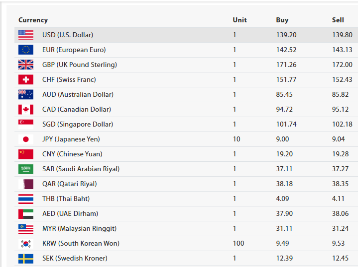 युरोपियन युरो एकको खरिददर एक सय ४२ रूपैयाँ ५२ पैसा र बिक्रीदर एक सय ४३ रूपैयाँ १३ पैसा, युके पाउन्ड स्ट्रलिङ एकको खरिददर एक सय ७१ रूपैयाँ २६ पैसा र बिक्रीदर एक सय ७२ रूपैयाँ, स्वीस फ्र्याङ्क एकको खरिददर एक सय ५१ रूपैयाँ ७७ पैसा र बिक्रीदर एक सय ५२ रूपैयाँ ४३ पैसा कायम गरिएको छ ।