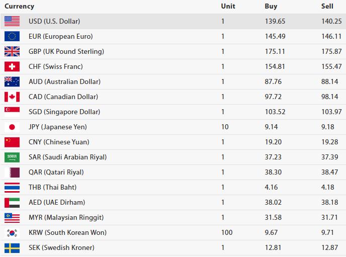 राष्ट्र बैंकले हङकङ डलर एकको खरिददर १७ रूपैयाँ ९३ पैसा र बिक्रीदर १८ रूपैयाँ ०१ पैसा, कुवेती दिनार एकको खरिददर ४५२ रूपैयाँ ६६ पैसा र बिक्रीदर ४५४ रूपैयाँ ६० पैसा, बहराइन दिनार एकको खरिददर ३७० रूपैयाँ ४१ पैसा र बिक्रीदर ३७२ रूपैयाँ ०१ पैसा र ओमनी रियाल एकको खरिददर ३६२ रूपैयाँ ६९ पैसा र बिक्रीदर ३६४ रूपैयाँ २५ पैसा निर्धारण भएको छ ।