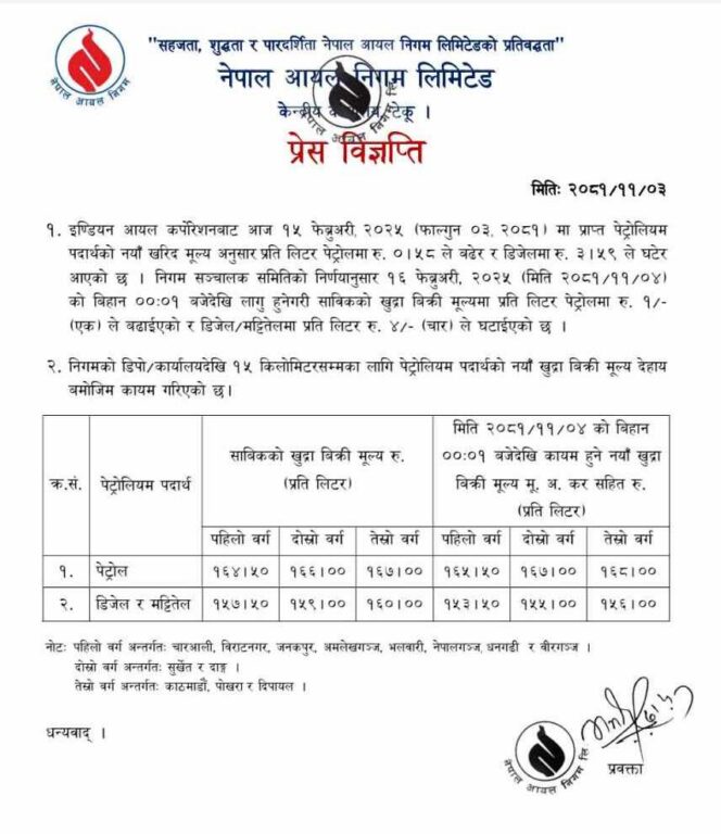 नयाँ मूल्य आइतबारदेखि लागू हुने निगमले जनाएको छ ।