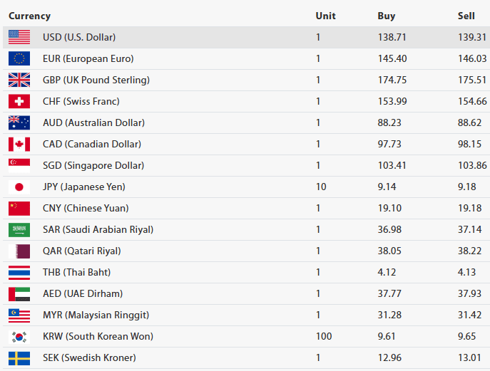 अमेरिकी डलर एकको खरिददर एक सय ३८ रूपैयाँ ७१ पैसा र बिक्रीदर एक सय ३९ रूपैयाँ ३१ पैसा, युरोपियन युरो एकको खरिददर एक सय ४५ रूपैयाँ ४० पैसा र बिक्रीदर एक सय ४६ रूपैयाँ तीन पैसा निर्धारण गरिएको छ ।
