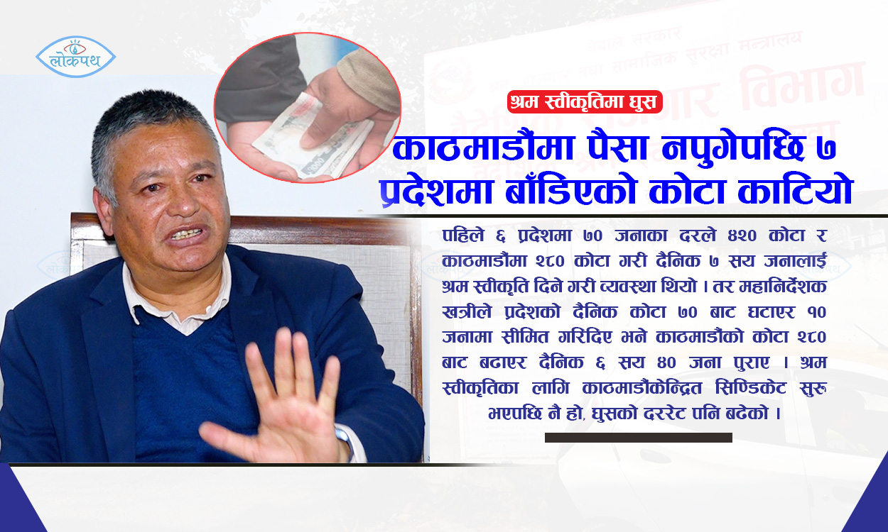 तर हालका महानिर्देशक सूर्य बहादुर खत्रीलाई हालका श्रम मन्त्री शरदसिंह भण्डारीले महानिर्देशक बनाएर ल्याएपछि अवस्था फेरियो । काठमाडौंबाट उठ्ने रकम थोरै भएपछि मन्त्रिपरिषद्को निर्णयबाट सातै प्रदेशबाट श्रम स्वीकृति दिने गरी छुट्टाइएको कोटा महानिर्देशक खत्रीले प्रदेशको दैनिक कोटा ७० बटाएर घटाएर १० जनामा सीमित गरिदिए । यता काठमाडौंको कोटा २८० बाट बढेर दैनिक ६ सय ४० जना पुग्यो । श्रम स्वीकृतिका लागि काठमाडौंकेन्द्रित सिन्डिकेट सुरु भएपछि नै हो, घुसको दररेट पनि बढेको ।