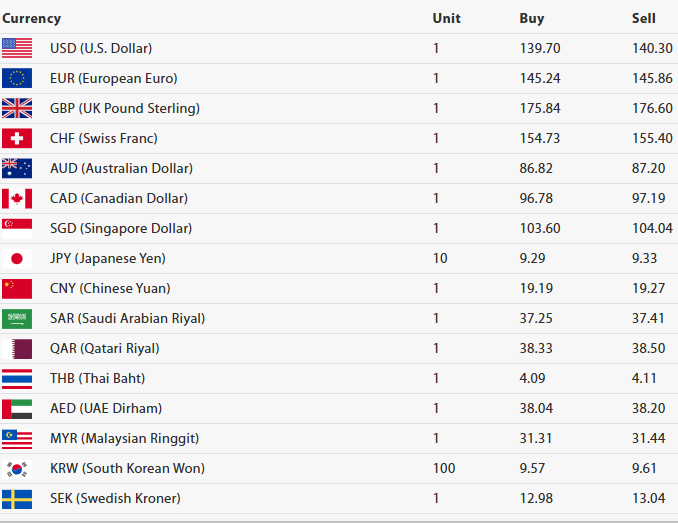 काठमाडौं । नेपाल राष्ट्र बैंकले आइतबार आजका लागि विदेशी मुद्राको विनिमयदर निर्धारण गरेको छ । आजका लागि निर्धारण गरिएको दरअनुसार अमेरिकी डलरको मूल्य हालसम्मकै उच्च बिन्दुमा पुगेको छ । केन्द्रीय बैंकका अनुसार आज अमेरिकी डलर एकको खरिददर १३९ रुपैयाँ ७० पैसा र बिक्रीदर १४० रुपैयाँ ३० पैसा कायम भएको छ ।