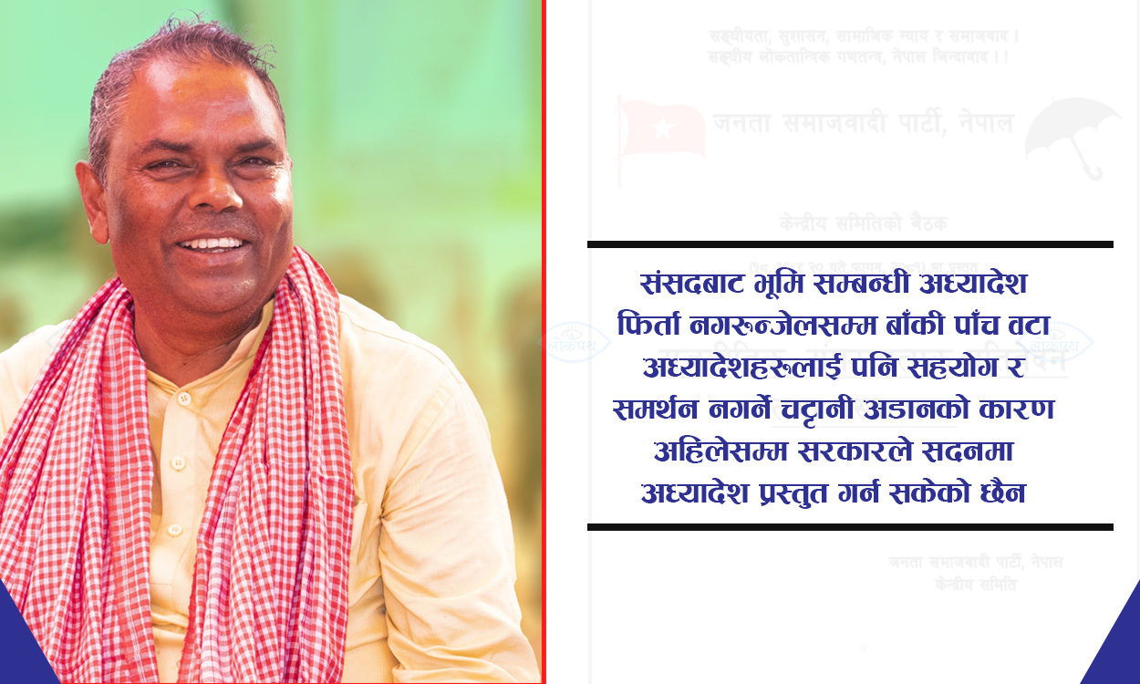 ‘संसदमा प्रस्तुत गरिएको ६ वटा विधयेक मध्ये भूमि सम्बन्धी केही नेपाल ऐनलाई संशोधन गर्न बनेको अध्यादेश देश र जनताको हितमा नरहेको, रियल स्टेट र भू–माफिया तथा दलालहरुको पक्षपोषण गर्ने खालको रहेको, तराई/मधेशको वनजंगल, सार्वजनिक जग्गा, आफ्ना पार्टीका कार्यकर्ताहरुमा वितरण गर्ने उद्देश्यका साथ ल्याइएको हो । उक्त अध्यादेश अनुसार वास्तविक भूमिहीन, सुकुमवासीहरुले जग्गा प्राप्त गर्न नसक्ने अवस्था रहेको छ र पर्यावरणीय संकट उत्पन्न भई समस्या झन् जटिल हुन सक्ने भएकाले हाम्रो पार्टी भूमि अध्यादेशको विरुद्धमा दृढताका साथ उभिएको छ । संसदबाट भूमि सम्बन्धी अध्यादेश फिर्ता नगरुन्जेलसम्म बाँकी पाँच वटा अध्यादेशहरुलाई पनि सहयोग र समर्थन नगर्ने चट्टानी अडानको कारण अहिलेसम्म सरकारले सदनमा अध्यादेश प्रस्तुत गर्न सकेको छैन । सरकारले जारी गरेको अध्यादेशमा रहेको गलत नीति छ र प्रावधानविरुद्ध हामीले लिएको अडानको कारण आज देश र जनतामा जसपा नेपालप्रतिको विश्वास झनै बढेर गएको छ,’ जारी प्रतिवेदनमा भनिएको छ ।