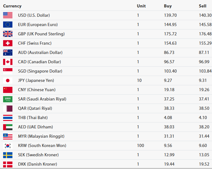 यसैगरी, युरो एकको खरिददर १४४ रुपैयाँ ९५ पैसा र बिक्रीदर १४५ रुपैयाँ ५८ पैसा, स्टर्लिङ पाउण्ड एकको खरिददर १७५ रुपैयाँ ७२ पैसा र बिक्रीदर १७६ रुपैयाँ ४८ पैसा, स्विस फ्र्याङ्क एकको खरिददर १५४ रुपैयाँ ६३ पैसा र बिक्रीदर १५५ रुपैयाँ २९ पैसा निर्धारण भएको छ ।  अष्ट्रेलियन डलर एकको खरिददर ८६ रुपैयाँ ७३ पैसा र बिक्रीदर ८७ रुपैयाँ ११ पैसा, क्यानेडियन डलर एकको खरिददर ९६ रुपैयाँ ५७ पैसा र बिक्रीदर ९६ रुपैयाँ ९९ पैसा, सिङ्गापुर डलर एकको खरिददर १०३ रुपैयाँ ४० पैसा र बिक्रीदर १०३ रुपैयाँ ८४ पैसा निर्धारण भएको छ ।