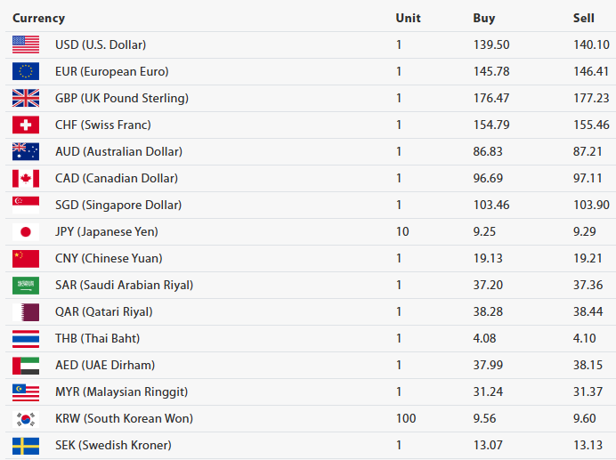 राष्ट्र बैंकले हङकङ डलर एकको खरिददर १७ रुपैयाँ ९४ पैसा र बिक्रीदर १८ रुपैयाँ दुई पैसा, कुवेती दिनार एकको खरिददर चार सय ५१ रुपैयाँ ७९ पैसा र बिक्रीदर चार सय ५३ रुपैयाँ ७४ पैसा, बहराइन दिनार एकको खरिददर तीन सय ७० रुपैयाँ १० पैसा र बिक्रीदर तीन सय ७१ रुपैयाँ ६९ पैसा, ओमनी रियाल एकको खरिददर तीन सय ६२ रुपैयाँ ३५ पैसा र बिक्रीदर तीन सय ६३ रुपैयाँ ९१ पैसा निर्धारण गरेको छ । त्यस्तै, भारतीय रुपैयाँ एक सयको खरिददर एक सय ६० रुपैयाँ र बिक्रीदर एक सय ६० रुपैयाँ १५ पैसा तोकेको छ । राष्ट्र बैंकले यो विनिमयदरलाई आवश्यकतानुसार जुनसुकै समयमा पनि संशोधन गर्न सकिने जनाएको छ ।