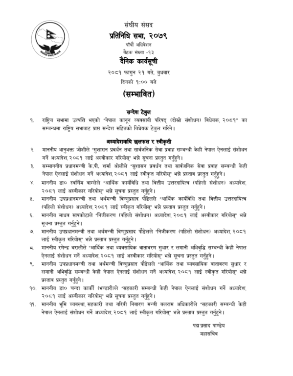 अर्थमन्त्री पौडेलले निजीकरण (पहिलो संशोधन) अध्यादेश, २०८१ स्वीकृत गरियोस् भन्ने प्रस्ताव राख्नेछन्, तर नेकपा माओवादी केन्द्रका सांसद माधव सापकोटाले उक्त अध्यादेश अस्वीकार गरियोस् भन्ने सूचना पेस गर्ने कार्यसूची रहेको छ।