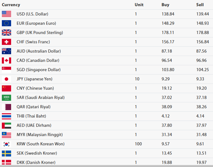 राष्ट्र बैंकले हङकङ डलर एकको खरिददर १७ रुपैयाँ ८६ पैसा र बिक्रीदर १७ रुपैयाँ ९४ पैसा, कुवेतीदिनार एकको खरिददर ४४९ रुपैयाँ ९६ पैसा र बिक्रीदर ४५१ रुपैयाँ ९१ पैसा, बहराइनदिनार एकको खरिददर ३६८ रुपैयाँ ३० पैसा र बिक्रीदर ३६९ रुपैयाँ ८९ पैसा, ओमनी रियाल एकको खरिददर ३६० रुयैयाँ ६४ पैसा र बिक्रीदर ३६२ रुपैयाँ २० पैसा रहेको छ । भारतीय रुपैयाँ एक सयको खरिददर १६० रुपैयाँ र बिक्रीदर १६० रुपैयाँ १५ पैसा तोकेको छ । राष्ट्र बैंकले यो विनिमय दरलाई आवश्यकतानुसार जुनसुकै समयमा पनि संशोधन गर्न सकिने जनाएको छ ।