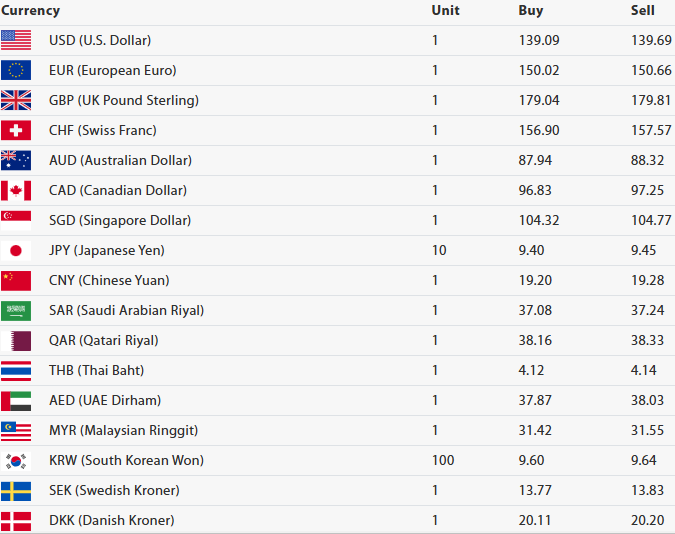 काठमाडौं । नेपाल राष्ट्र बैंकले आजका लागि विदेशी मुद्राको विनिमयदर निर्धारण गरेको छ । राष्ट्र बैंकका अनुसार अमेरिकी डलर एकको खरिददर १३९ रुपैयाँ ०९ पैसा र बिक्रीदर १३९ रुपैयाँ ६९ पैसा कायम भएको छ ।