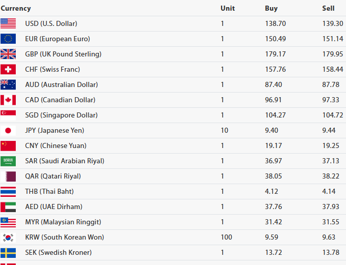 केन्द्रीय बैंकका अनुसार थाई भाट एकको खरिददर चार रूपैयाँ १२ पैसा र बिक्रीदर चार रूपैयाँ १४ पैसा, युएई दिराम एकको खरिददर ३७ रूपैयाँ ७६ पैसा र बिक्रीदर ३७ रूपैयाँ ९३ पैसा, मलेसियन रिङ्गेट एकको खरिददर ३१ रूपैयाँ ४२ पैसा र बिक्रीदर ३१ रूपैयाँ ५५ पैसा, साउथ कोरियन वन एक सयको खरिददर नौ रूपैयाँ ५९ पैसा र बिक्रीदर नौ रूपैयाँ ६३ पैसा, स्वीडिस क्रोनर एकको खरिददर १३ रूपैयाँ ७२ पैसा र बिक्रीदर १३ रूपैयाँ ७८ पैसा र डेनिस क्रोनर एकको खरिददर २० रूपैयाँ १८ पैसा र बिक्रीदर २० रूपैयाँ २६ पैसा तोकिएको छ ।