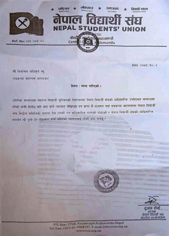 त्यसको जवाफ दिँदै शेर्पाले भनेका छन्, ‘पद्मकन्या क्याम्पसमा नेपाल विद्यार्थी संघ केन्द्रीय समितिको नाममा पेस भएका पत्र आधिकारिक नभएको पाइएको र नेपाल विद्यार्थी संघको आधिकारिक समर्थन श्री भुपी ऐर नेतृत्वमा दर्ता गरिएको प्यानललाई रहेको स्पष्ट पार्दछु ।’