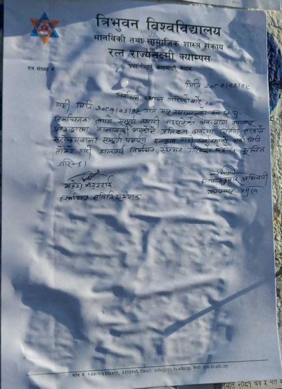 क्याम्पस प्रमुख अधिकारीले सूचनामा सरोकारवाला पक्षासँग छलफल गरी अर्को मिति तोक्ने गरी हाललाई निर्वाचन स्थगित गरिएको उल्लेख गरेका छन् ।