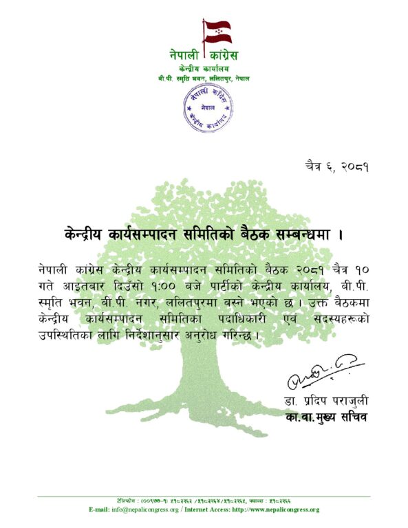 काठमाडौं । सत्तारुढ दल नेपाली कांग्रेसले कार्यसम्पादन समितिको बैठक आह्वान गरेको छ ।