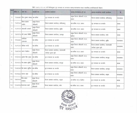 यस्तै सहसचिव दिलकुमार तामाङलाई कपिलवस्तु, जगदीश्वर उपाध्यायलाई सुर्खेत, भविश्वर पाण्डेलाई नवलपरासी पूर्व, कुमानसिंह गुरुङलाई बागलुङ, प्रेमप्रसाद लुइँटेललाई उदयपुर र आनन्द सारूलाई अछामको सिडिओको जिम्मेवारी दिएर पठाइएको छ ।