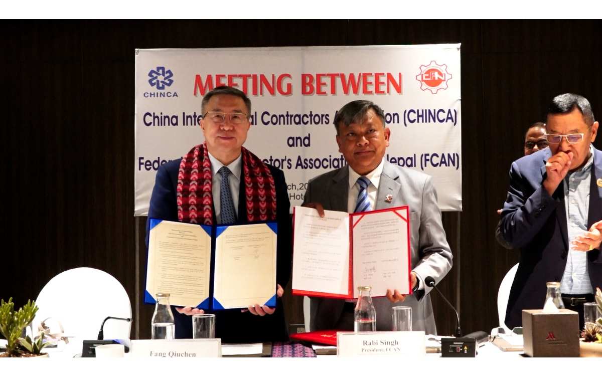 शुक्रबार काठमाडौंमा भएको सम्झौतामा नेपाल निर्माण व्यवसायी महासंघ (फक्यान) को तर्फबाट अध्यक्ष रवि सिंहले हस्ताक्षर गरे भने चाइना इन्टरनेशनल कन्ट्रयाक्र्टस एशोसिएसन (चिनका) को तर्फबाट फाङ किउचेनले हस्ताक्षर गरेका हुन् ।