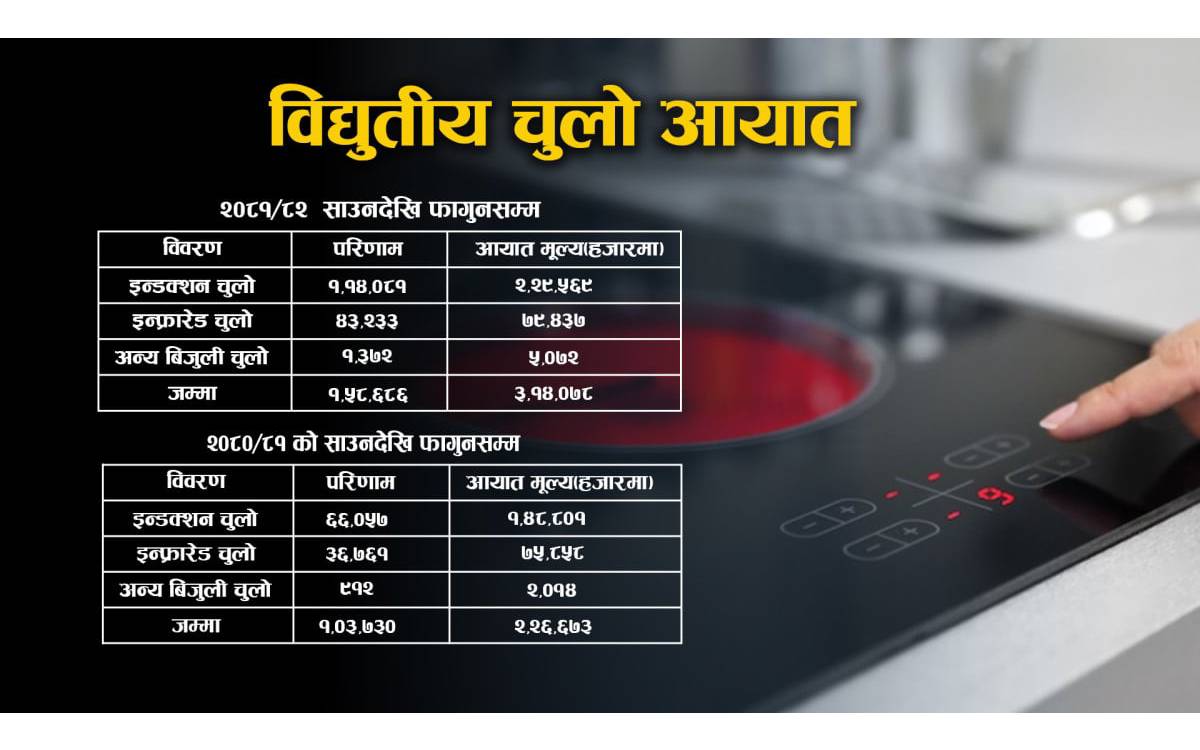 काठमाडौं । पछिल्लो समय नेपालमा विद्युतीय चुलोको प्रयोग बढेर गएको छ । भन्सार विभागको पछिल्लो तथ्यांकअनुसार साउनदेखि फागुनसम्मको अवधिमा नेपालमा २०८१/८२ मा ३१ करोड ४० लाख खर्चेर १५ लाख ८ हजार ६८६ ओटा विद्युतीय चुलो आयात गरिएको छ ।