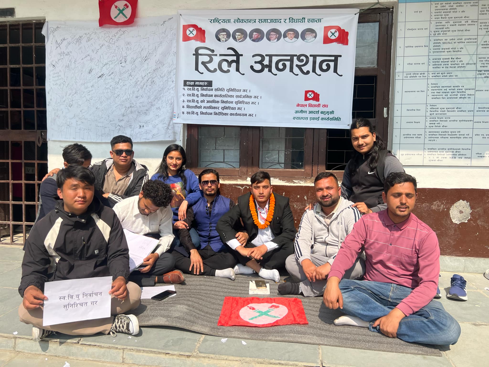 नेविसंघले निर्वाचन जित्ने भएसँगै विभिन्न बहानामा निर्वाचन रोकिएको र त्यसको सुनिश्चितताको माग गर्दै रिले अनसन सुरु गरिएको नेविसंघ ग्रामीण आदर्श बहुमुखी क्याम्पसका ईकाइ अध्यक्ष महेशमणी पौडेलले जानकारी दिए ।