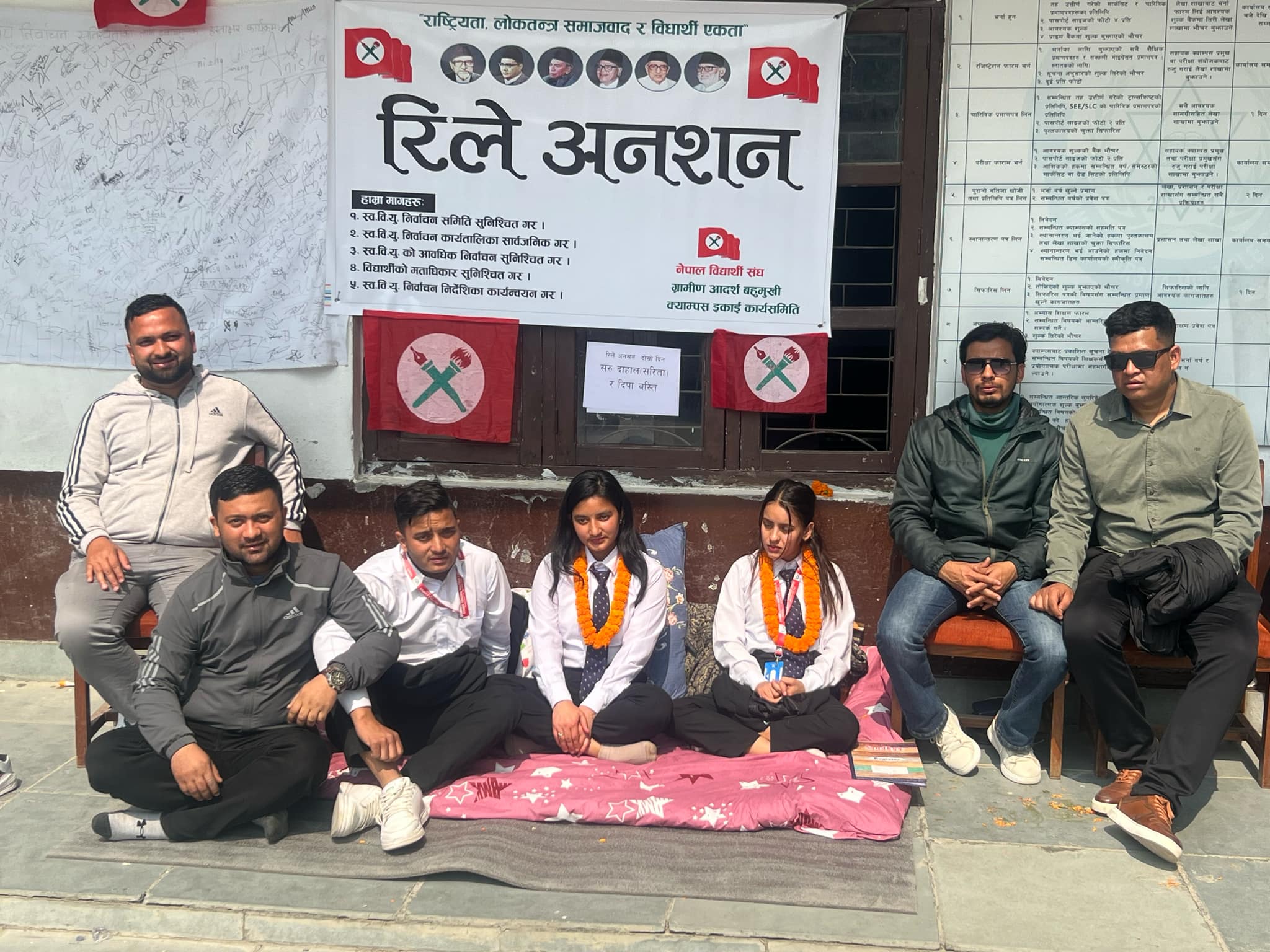 पनि रिले अनसनलाई निरन्तरता दिँदै नेविसंघका नेतृद्वय सरिता दाहाल (सरु) र दीपा वस्ती अनसनमा बसेको ग्रामीण आदर्श बहुमुखी क्याम्पस नेविसंघका इकाइ अध्यक्ष महेशमणी पौडेलले जानकारी दिए ।