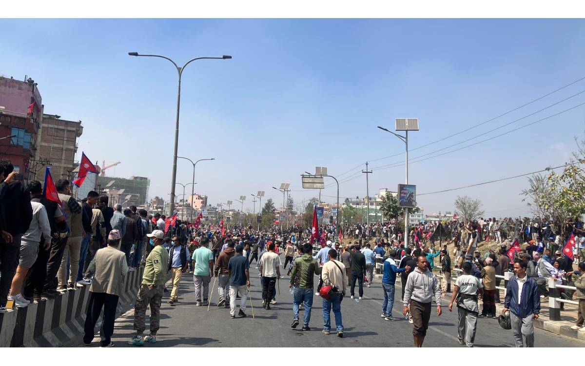 प्रहरीले राजावादीहरूले बनाएको मञ्च तोडफोड गरेको छ भने प्रदर्शनकारीहरूलाई कोटेश्वर र सिनामंगलतर्फ लखेटिरहेको छ ।