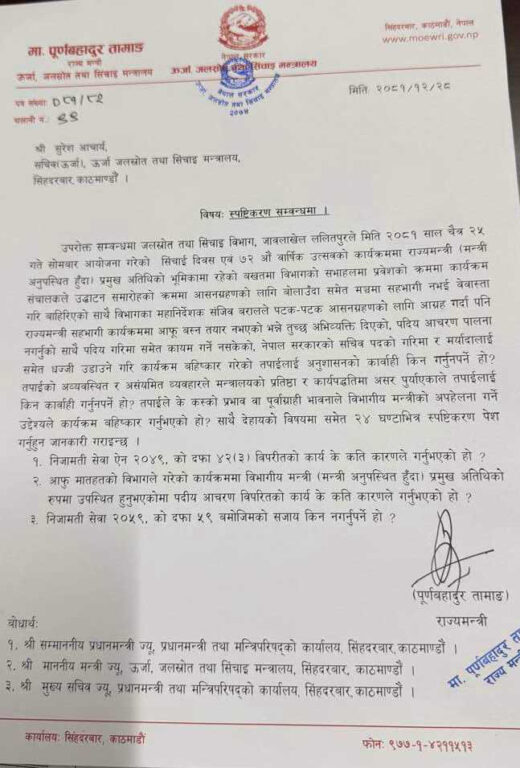 काठमाडौं । उर्जा राज्यमन्त्री पूर्णबहादुर तामाङ (कान्छाराम) ले उर्जा मन्त्रालयको सचिव सुरेश आचार्यमाथि अुनशासनको कारबाही गर्ने भन्दै स्पष्टीकरण सोधेका छन् ।