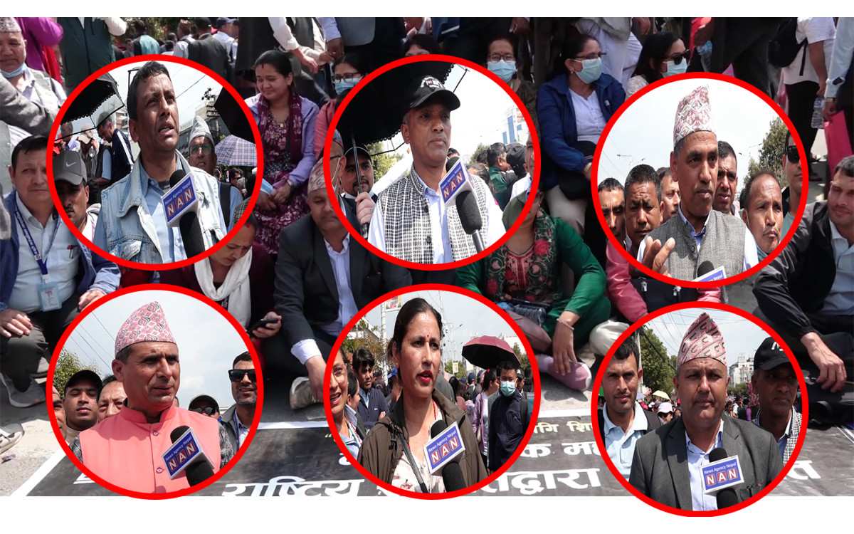 शिक्षक आनन्दराम खनालले सरकारले नै शिक्षकहरूका माग सम्बोधन नगरेर राज्यको शिक्षा प्रणालीमाथि नै कुठाराघात गरेको आरोप लगाए । उनले नेपालको शैक्षिक क्षेत्र सुधार र गुणस्तरीय शिक्षाको सुनिश्चितताको लागि अन्तिम संघर्ष गरिरहेको बताए । ।