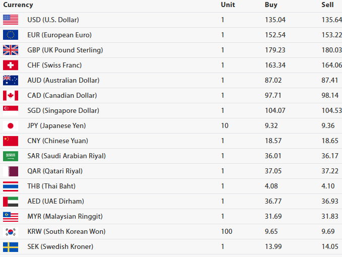 त्यसैगरी युरोपियन युरो एकको खरिददर १५२ रूपैयाँ ५४ पैसा र बिक्रीदर १५३ रूपैयाँ २२ पैसा, युके पाउन्ड स्टर्लिङ एकको खरिददर १७९ रूपैयाँ २३ पैसा र बिक्रीदर १८० रूपैयाँ ०३ पैसा, स्वीस फ्र्याङ्क एकको खरिददर १६३ रूपैयाँ ३४ पैसा र बिक्रीदर १६४ रूपैयाँ ०६ पैसा कायम गरिएको छ ।