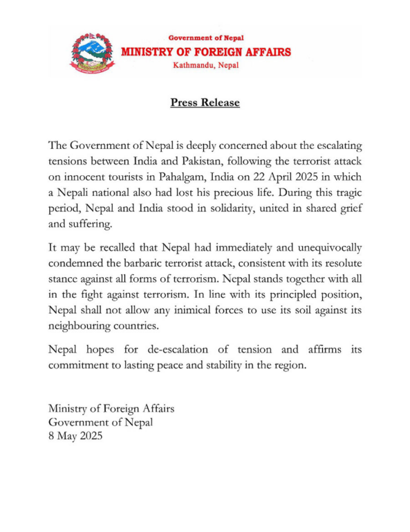 काठमाडौं । भारत र पाकिस्तानबिचको जारी तनावबारे नेपालले आफ्नो धारणा सार्वजनिक गरेको छ ।