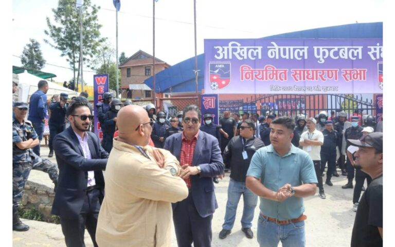 काठमाडौं । अखिल नेपाल फुटबल संघ (एन्फा) को साधारण सभामा पूर्व अध्यक्ष गणेश थापालाई प्रवेशमा रोक लगाइएपछि शुक्रबार धुलिखेलमा विवाद उत्पन्न भएको छ ।