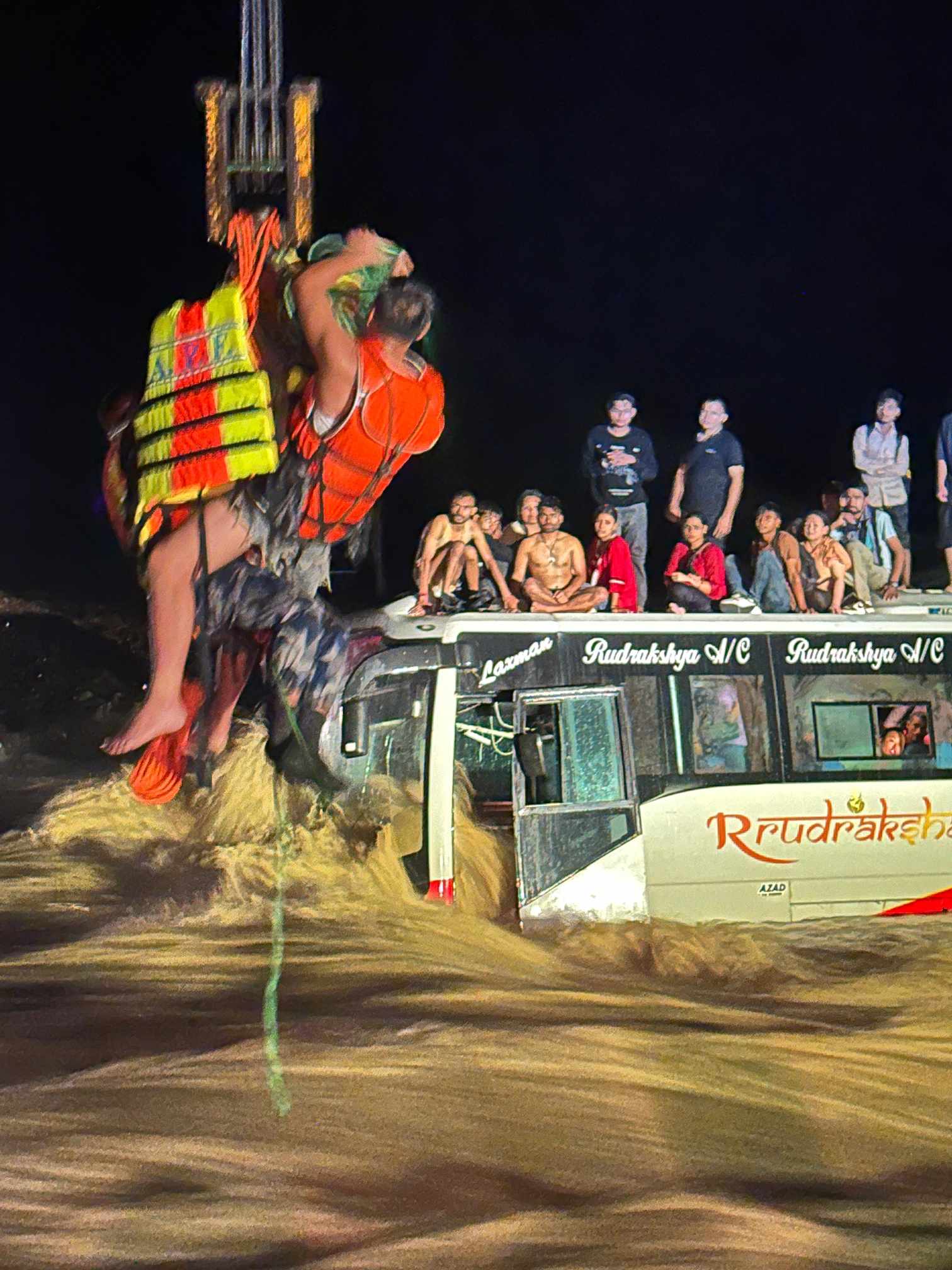 उनीहरूमध्ये २७ जनालाई सशस्त्र प्रहरी बल नेपाल नं. ३१ गुल्म पूर्वी नवलपरासीबाट सशस्त्र प्रहरी नायव उपरीक्षक विनोद कार्कीको कमान्ड तथा सुरक्षा बेस चोरमारा र सर्दीबाट खटिएको सुरक्षा फौजले क्रेन र डोजको सहायताले सकुशल उद्धार गरेको हो । बसमा सवार अन्य यात्रुहरू भने फस्नासाथ पानी बाहिर निस्किएका थिए । उद्धार गरिएका सबै यात्रुको अवस्था भने सामान्य रहेको छ । उद्धार कार्य एकछिन ढिला भएको भए मानवीय क्षति हुने सम्भावना थियो ।