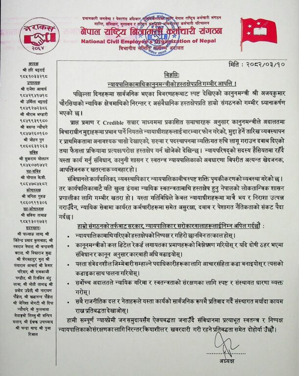 साथै कानुन मन्त्रीका सम्बन्धमा आएका समाचार आदिबारे सर्वोच्च अदालतले न्यायिक गरिमा र स्वतन्त्रताको संरक्षणका लागि संस्थागत धारणा राख्नसमेत माग गरिएको छ भने सबै राजनीतिक दल र नेताहरूले यस्ता कार्यको सार्वजनिक रूपमै प्रतिवाद गर्दै संस्थागत मर्यादा कायम राख्ने प्रतिबद्धता जनाउन समेत माग गरेको छ ।