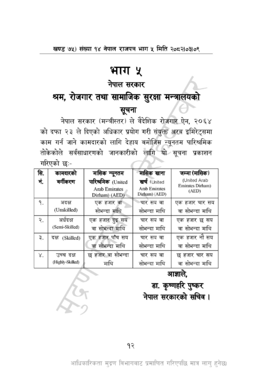 काठमाडौं । संयुक्त अरब इमिरेट्स (यूएई) मा नेपाली कामदारका लागि सरकारले तोकेको नयाँ न्यूनतम पारिश्रमिक कार्यान्वयनमा आएको छ । सोमबार राजपत्रमा सूचना प्रकाशित भएसँगै यो निर्णय लागू भएको हो ।