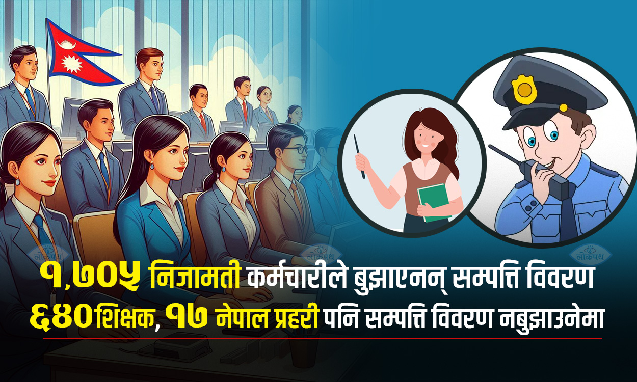 चालु आर्थिक वर्ष २०८१।०८२ मा १ हजार ७०५ निजामती कर्मचारी, ६४० जना शिक्षक, नेपाल प्रहरीका ७१ कर्मचारी, सशस्त्र प्रहरीका एक जना र राष्ट्रिय अनुसन्धानका ७ जना कर्मचारीले आफ्नो सम्पत्ति विवरण नबुझाएको पाइएको छ ।