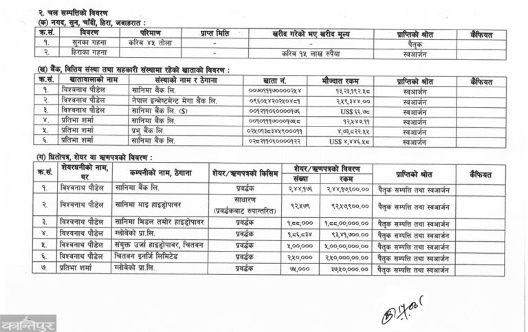 ती सेयरमध्ये सानिमा माई हाइड्रोपावर कम्पनीको साधारण (प्रवर्द्धकबाट साधारणमा परिणत भएको) र बाँकी सबै प्रवर्द्धक सेयर रहेको पौडेलले प्रस्ट्याएका छन् । स्वआर्जन र पैतृक सम्पत्तिबाट उक्त लगानी गरिएको उल्लेख छ ।