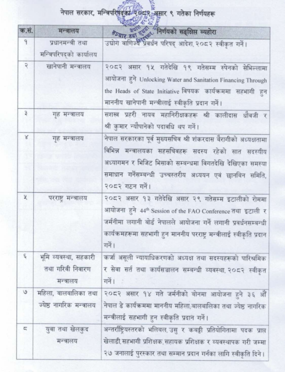 त्यसैगरी, बैठकले असार १३ गतेदेखि २९ गतेसम्म इटालीमा आयोजना हुने संयुक्त राष्ट्रसंघीय खाद्य तथा कृषि संगठन (एफएओ) को ४४औँ सत्रमा सहभागी हुन परराष्ट्र मन्त्रीलाई स्वीकृति दिने निर्णय पनि गरेको छ। साथै, लगानी बोर्ड नेपालले इटाली र जर्मनीमा आयोजना गर्ने लगानी प्रवर्धन कार्यक्रमहरूमा पनि परराष्ट्र मन्त्रीको सहभागिता सुनिश्चित गरिएको छ।