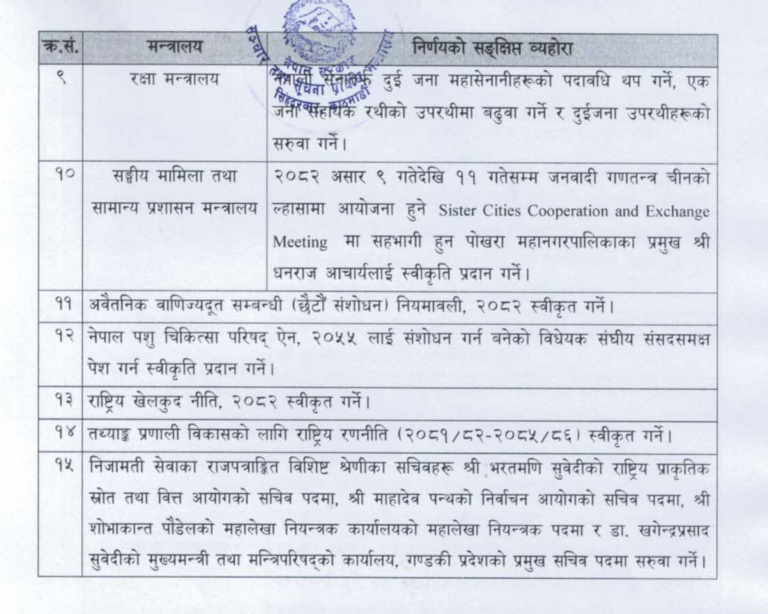 काठमाडाैं । सरकारले सोमबार बसेको मन्त्रिपरिषद् बैठकका १५ निर्णय सार्वजनिक गरेको छ। सिंहदरबारमा आयोजित पत्रकार सम्मेलनमार्फत सञ्चार तथा सूचना प्रविधि मन्त्री तथा सरकारका प्रवक्ता पृथ्वीसुब्बा गुरुङले निर्णयहरू सार्वजनिक गरेका हुन्।