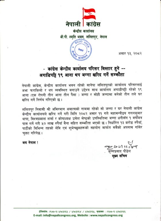 विज्ञप्तिमा भनिएको छ, ‘नेपाली कांग्रेस, केन्द्रीय कार्यालय भवन रहेको सानेपा ललितपुरको कार्यालय परिसरलाई अझ फराकिलो र थप व्यवस्थित बनाउने उद्देश्यले कार्यालय अगाडिपट्टि रहेको १९ आना जग्गा र तीन तले घर खरिद गर्ने निर्णय गरिएको हो।’