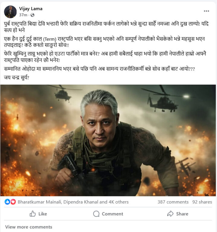 पाइलट लामाले लेखेका छन्, ‘पूर्व राष्ट्रपति विद्यादेवी भन्डारी फेरि सक्रिय राजनीतिमा फर्कन लागेको भन्ने सुन्दा साह्रै नमज्जा अनि दुख लाग्यो ! यदि सत्य हो भने ।