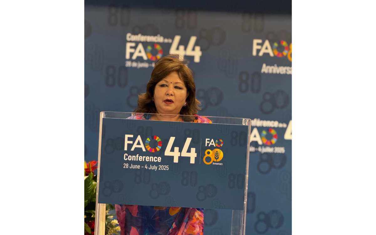 रोममा आयोजित राष्ट्रसंघीय खाद्य तथा कृषि संगठनको ४४औँ महासभालाई सोमबार सम्बोधन गर्दै उनले जलवायु परिवर्तनको मार खेपिरहेका नेपाल र यहाँका विशेष गरी हिमाली क्षेत्रका लागि अनुदानमा आधारित अन्तर्राष्ट्रिय जलवायु वित्त सुनिश्चित गर्न  आग्रह गरिन् ।