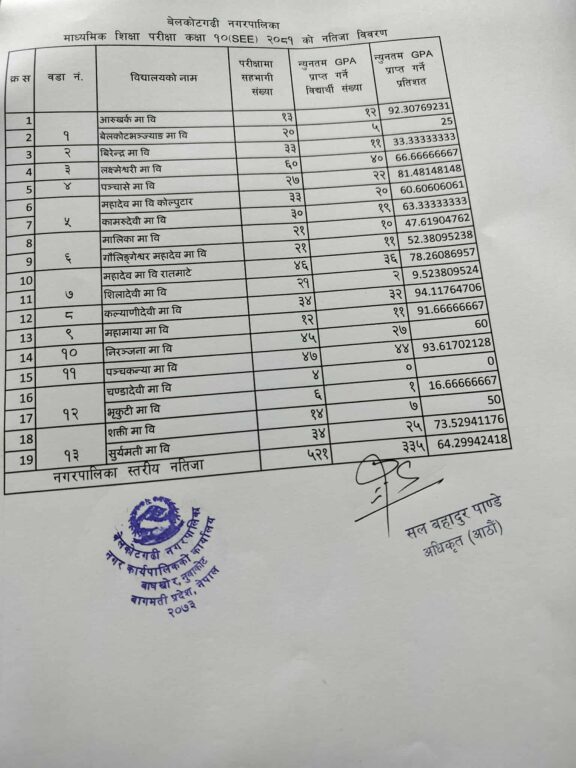 नुवाकोट । जिल्लाको बेलकोटगढी नगरपालिका–८ बाहुँनडाडामा रहेको कल्याणीदेवी माध्यामिक विद्यालय यस वर्षको माध्यमिक शिक्षा परीक्षा (एसईई) मा उत्कृष्ट बनेको छ ।