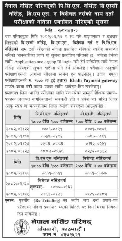 प्रकाशित नतिजामा पिसिएल नर्सिङ, बिएस्सी नर्सिङ, बिएमएस तथा विशेषज्ञ नर्स तह समावेश छन्। परीक्षार्थीहरूले परिषद्को वेबसाइट www.nnc.org.np मा लगइन गरेर वा परिषद्को कार्यालय, बाँसबारीमा रहेको सूचना पाटीबाट नतिजा हेर्न सक्नेछन्।