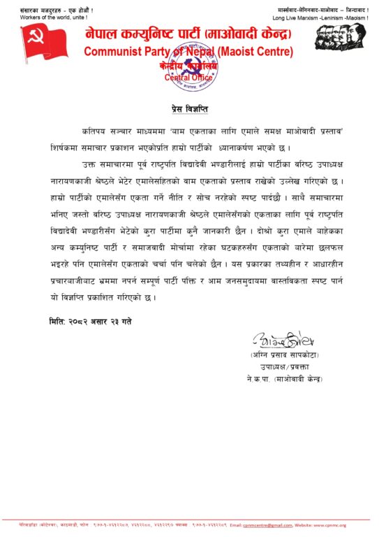 उक्त विषयहरुमा असत्य रहेको भन्दै भ्रममा नपर्न समेत माओवादी केन्द्रले भनेको छ ।